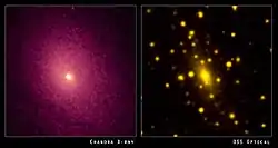 ![]() Imagen de A2029 en rayos X del Observatorio Chandra (izquierda) y En el óptico de la Digitized Sky Survey (derecha). | ||