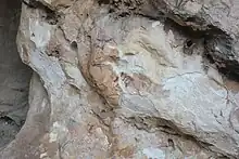 - Escena con tres cuadrúpedos pintados en negro encima de una capa blanquecina. Sobre uno de ellos se superpone una figura humana en color rojo con los brazos en aspa.