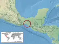 Es endémica de Chiapas (México). Únicamente se conoce para la localidad tipo en Cerro La Vela, Rancho El Recuerdo, a 1350 m s. n. m., en Sierra Madre de Chiapas, municipio de Jiquipilas, Chiapas, México.