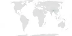 Se encuentra en el Himalaya y sus estribaciones orientales, distribuidos por las montañas del noreste de la India, Bután, Nepal, el sur de China, Birmania y el norte de Vietnam. Su hábitat natural son los bosques subtropicales húmedos de montaña.