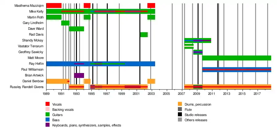 1989 - 1990 (como Dolmen) 1990 (como Azathoth) 1990 (como Eternus) 1990 (como Necrotic) 1991 - 2002 2007 - presente | |