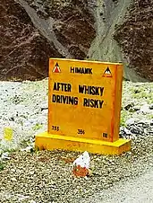 "Después de Whiskey Driving Risky". cartel de seguridad en Ladakh, India