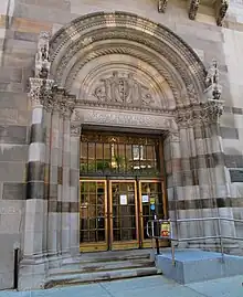 El exterior del edificio utiliza una combinación de variedades de piedra caliza y arenisca. La entrada principal, en la calle 103, utiliza una serie de columnas románicas, rematadas con estatuas de leones. Las puertas son de bronce ornamentado con diseños florales y pequeñas figuras de Asclepio , dios de la medicina y los médicos, de Higía , hija de Asclepio y diosa de la salud. Los dos dioses también están tallados en el tímpano de la entrada , asistidos por perros, simbolizando la vigilancia y alejando la muerte y la enfermedad.[5] El exterior también presenta muchas inscripciones en latín de autores notables, como Cicerón , Hipócrates , Juvenal , Séneca el Joven.y Virgil . Las ventanas del primer piso tienen rejas exteriores de bronce ornamentales, decoradas con un diseño románico. Los dinteles de esas ventanas tienen figuras de dioses y fauna que simbolizan la medicina e inscripciones en latín adicionales.