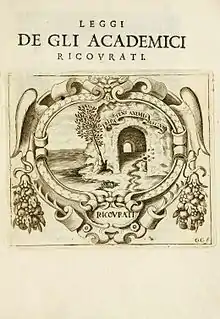 Página titular de Leggi de gli Academici Ricovrati (1648) con el emblema del bipatens animis asylum