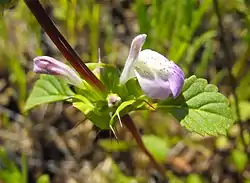 Esta es una pequeña hierba anual que crece hasta unos 15 centímetros de altura máxima. Tiene las hojas redondeadas u ovales, dentadas de hasta 1,5 centímetros de largo. La inflorescencia es un racimo de flores con forma ovalada, con brácteas de casi un centímetro de largo que están bordeadas de espinas. Cada flor es de un centímetro de ancho y de color blanco, a menudo teñida de color púrpura o rosa.