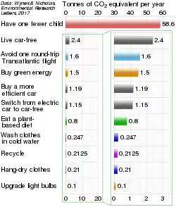 Una acción considerada por algunos expertos como de gran impacto es tener un hijo menos,[1] estimando un ahorro en los países más desarrollados de 58,6 toneladas de CO2e al año.[1][8]