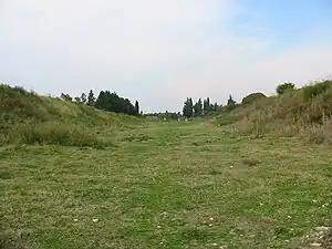 - El estadio (en el plano, n° 26), construido poco después de la fundación de la ciudad, podría haber tenido una capacidad de 10000 espectadores y contenía dos extremos semicirculares (sphendones), típicos del tipo anfiteatro que estaba en uso durante los primeros 200 años del principado. Los estadios de la antigua Laodicea (cerca de Pamukkale, Turquía) y Afrodisias (Turquía) tienen una arquitectura similar. El lado norte fue construido en la ladera de una colina, mientras que se utilizaron depósitos artificiales para los otros lados. Las paredes estaban hechas de un núcleo de escombros entre ladrillos. En el lado oeste existían tres entradas absidales, la central más grande que las otras, que conducían al gymnasion, (en el plano, n° 25). En el sphendone sur había habitaciones residenciales e instalaciones para atletas y espectadores (posadas, tiendas, alojamientos, etc.). Las entradas en el sphendone del este llevaban al cercano teatro.