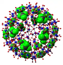 Achim Müller descubrió las esferas gigantes moleculares (Kepleratos ) tipo Mo132 (diámetro aprox. 3 nm) y sus derivados,[9] la rueda Mo154 en forma de clúster (Ref. [1] y[10]) y el clúster en forma de erizo Mo368 (aumentó a 6 nm). Estos resultados contribuyeron a un cambio de paradigma en la química de polioxometalato, no sólo teniendo en cuenta el tamaño molecular que se trate, pero sobre todo debido a las propiedades únicas observadas en estos nanomateriales. Estas moléculas son bastante grandes, por ejemplo, teniendo en cuenta la longitud de una molécula con dos átomos de oxígeno (0,12 nm) como un metro, el clúster Mo368 tiene un diámetro unas 50 veces mayor. El trabajo de Müller en este campo muestra un gran número de aplicaciones (ver arriba), tales como los procesos celulares que implican el transporte de iones que puede ser modelizada en las cápsulas esféricas porosas.[11][12] y este último puede ser utilizado para eliminar compuestos tóxicos del agua.[13] Todos estos grupos pertenecen a una clase de compuestos conocidos como polioxometalatos, y algunos en particular como la familia azules de molibdeno.[14][15] Los polioxometalatos se estudian en todo el mundo por muchos grupos de investigación, y la investigación de Müller ha reorientado la investigación sobre polioxometalatos en el campo de la Ciencia de los Materiales.