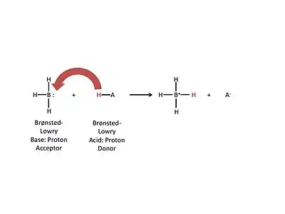 El químico danés Johannes Nicolaus Brönsted y el químico inglés Lowry en 1923 propusieron un concepto sobre el comportamiento de los ácidos y las bases.[1] Esta teoría propone que un ácido es definido como una entidad donadora de protones y una base como una entidad aceptora de protones, esta debe tener un par de electrones para compartir ya sea un par solitario o uno en un orbital.[2] Esta teoría no se contrapone con la teoría propuesta por Arrhenius, solo la hace más extensiva para aquellas sustancias en fase gaseosa o que no se encuentran en disolución acuosa.