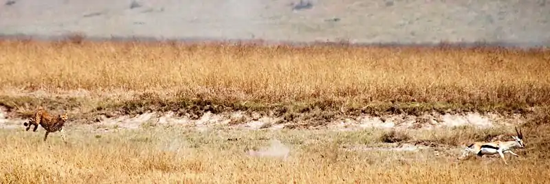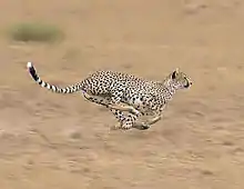 El guepardo es el animal terrestre más veloz del mundo en distancias cortas: corre a una velocidad máxima de entre 29 m/s (104 km/h)(Puede pasar de 0 a 97 km/h en 3 segundos o menos),[5][17] aunque, si no alcanza su presa en menos de unos 400 metros, abandona la persecución.[18] Debe hacerlo pues sus características físicas no le permiten tener una resistencia que usualmente vaya más allá de esta distancia, especialmente debido al sobrecalentamiento de su cuerpo. Si el intento de caza ha sido exitoso, deberá buscar de inmediato una zona con sombra a la que llevar a su presa, para evitar a los carroñeros como hienas manchadas.