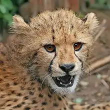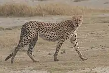 El guepardo (Acinonyx jubatus)[1] es una especie de mamífero carnívoro de la familia de los félidos. Es el único representante vivo del género Acinonyx. Caza gracias a su vista y a su gran velocidad. Es el animal terrestre más veloz, ya que alcanza una velocidad punta de 29 m/s (104 km/h) a lo largo de un recorrido de 201,2 m.[5] Las hembras pueden tener hasta cinco cachorros por camada. Su presa principal es la gacela de Thomson.