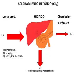 El aclaramiento hepático se define como el volumen de sangre que se depura de un fármaco por unidad de tiempo a su paso por el hígado utilizando mecanismos de biotransformación hepática y excreción biliar. La eliminación a nivel hepático depende del flujo sanguíneo hepático (h) y del coeficiente de extracción hepática (Eh).