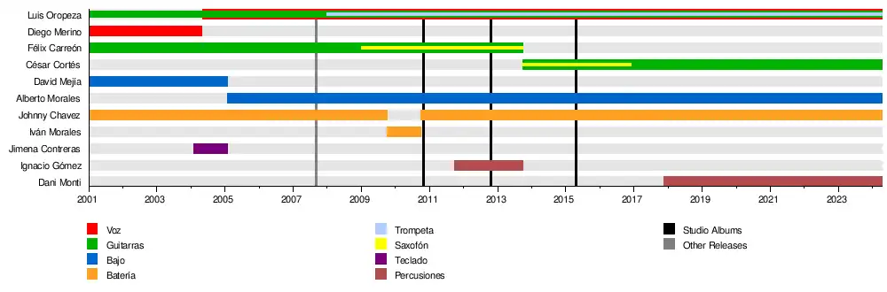 La alineación actual incluye a Oropeza, el baterista Johnny Chavez, guitarrista César Cortés, bajista Alberto Morales y percusionista Dani Monti. La banda ha lanzado tres álbumes de estudio, un E.P., y dos vídeos musicales desde su formación.