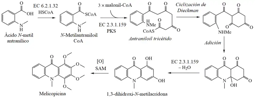 Enzimáticamente, las acridinas naturales se sintetizan por una policétido sintasa (acridona sintasa):[3]