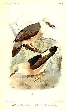 Subespecies S. b. burmannicus (superior), y S. b. leucocephalus (inferior); ilustración de Joseph Smit, 1890
