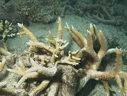 La Lista Roja de Especies Amenazadas de la Unión Internacional para la Conservación de la Naturaleza califica esta especie como de Preocupación menor ver 3.1, a partir de una evaluación de 2008.[1] No obstante, el creciente aumento de la temperatura del mar está incrementando dramáticamente la muerte de corales por blanqueo en todo los océanos, y las proyecciones actuales de los expertos auguran para todo el siglo XXI episodios anuales severos de blanqueo de corales en el 99% de los arrecifes de todo el mundo.[15] De hecho, recientes estudios han constatado que en 2016 ha muerto aproximadamente el 35% de los corales en 84 áreas de las secciones norte y centro de la Gran Barrera de Coral australiana, debido al blanqueo de coral producido por el aumento de la temperatura del mar.[16] También durante 2016, el principal arrecife de Japón, en el archipiélago de Okinawa, sufrió una decoloración por blanqueo del 70% de su extensión, y el arrecife más septentrional del mundo, situado frente a las costas de la isla japonesa de Tsushima, dónde sus aguas templadas suelen evitar episodios de blanqueo, ha sido afectado por primera vez en el 30% de su extensión, según afirma un estudio realizado en diciembre de 2016 por el Instituto Nacional de Estudios Medioambientales de Japón (NIES).[17]
