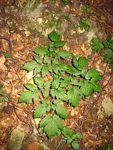 Es una planta vivaz perenne su raíz es un rizoma grueso y nudoso que cada año emite tallos erectos con pocas ramas, alcanzando 60 cm de altura. Las hojas, intensamente lobuladas, tienen unos largos peciolos que a menudo brotan de la raíz y que a su vez se dividen en otros tres. Las flores, pequeñas, son blancas y se presentan en racimos. El fruto, muy venenoso, es una baya de 1 cm de diámetro, de color negro y con numerosas semillas.