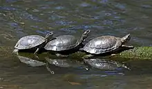 Viven tanto en aguas permanentes y temporales, incluyendo pantanos, arroyos, ríos, estanques y lagos. Viven en los hábitats con un gran número de rocas o troncos para tomar el sol. También toman el sol en la parte superior de la vegetación acuática o se posicionan justo debajo de la superficie, donde las temperaturas del agua son elevadas. Los individuos muestran un comportamiento agresivo hacia los demás, mientras toman el sol, rápidamente saltan al ser abordados por los seres humanos, incluso a distancias de más de 50 m. En consecuencia, esta especie es a menudo pasado por alto en la naturaleza. Sin embargo, es posible observar las tortugas si se mueve lentamente y escondiéndose detrás de árboles y arbustos.