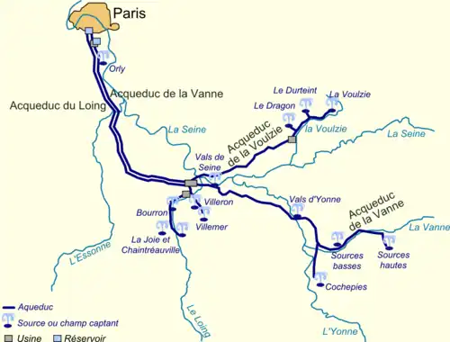 Construido entre 1897 y 1900, además del acueducto del Vanne, cuyo curso sigue desde el bosque de Fontainebleau hasta París, el acueducto del Loing tiene una longitud total más corta: 95 km. Pero su caudal es mayor porque su sección es mayor y, además, recibe agua de dos acueductos secundarios: el del Voulzie y el del Lunain.