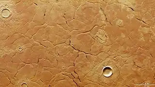 Muestra parte de una región conocida como Adamas Labyrinthus, que se encuentra en Utopia Planitia en las tierras bajas del norte de Marte. Aquí, los bloques de forma aleatoria varían en tamaño de 5 a 20 km de ancho y están separados por canales transversales con anchos de hasta 2 km. | ||