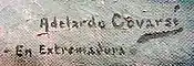 Adelardo Covarsí, de Badajoz. Cursó sus estudios en la Escuela Municipal de Artes y Oficios de Badajoz y en la Escuela de Bellas Artes de San Fernando de Madrid, realizando varios viajes por Europa al finalizar aquellos. Está en posesión de una Medalla de Oro alcanzada en la Exposición Internacional de Bellas Artes de Panamá, el año pasado, y ha obtenido diversas Medallas de Plata y Bronce en las Exposiciones Nacionales de Madrid de 1908 y 1912, Internacional de Buenos Aires y la Hispano-Francesa [de 1908].
