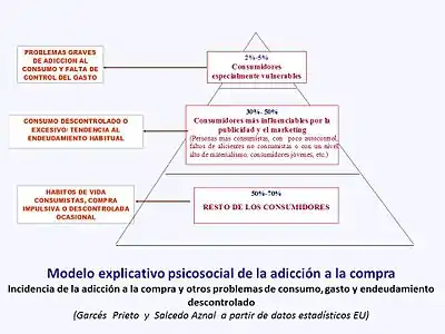 - Enfoque psicosocial: a partir de la década de 1980, se constató un espectacular aumento del número de personas con problemas de autocontrol en la compra y en el gasto. Como este aumento era paralelo al desarrollo de la sociedad de consumo y la extensión de los valores y comportamientos consumistas, se empezó a considerar que los casos más graves de adicción a la compra eran manifestaciones individuales intensas de un problema social general. Entre estos modelos se encuentra los de Javier Garcés y Alejandro Salcedo[16] para los que la adicción a la compra es la “punta del iceberg”, es decir, la manifestación más intensa de un problema general, que afectaba, en mayor o menor medida, a una gran parte de la población. En la actual sociedad las diferencias entre los comportamientos del consumidor medio y los adictos a la compra son más cuantitativos que cualitativos. Las influencias tentaciones publicitarias y comerciales, que provocan en algunas personas graves problemas de adicción a la compra o endeudamiento excesivo son los mismos que provocan los comportamientos consumista de la mayoría de los ciudadanos.[17] La “pirámide consumista” describe gráficamente este modelo.Otro modelo es el defendido por Helga Ditmar que puede considerar mixto, ya que señala que los problemas de adicción a la compra son producto de la confluencia de dos factores: un alto nivel de valores materialistas y una alta discrepancia entre el autoconcepto real (como se ve a sí misma la persona) y el autoconcepto ideal (como desearía verse).[18]