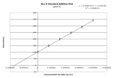 Supongamos que la concentración de plata en muestras de residuos fotográficos se determina mediante espectrometría de absorción atómica. Usando el método de la curva de calibración, un analista podría calibrar el espectrómetro con algunas soluciones acuosas de una sal de plata pura y utilizar el gráfico de calibración resultante en la determinación de la plata en las muestras de prueba. Sin embargo, este método solo es válido si una solución acuosa pura de plata y una muestra de desechos fotográficos que contienen la misma concentración de plata dan los mismos valores de absorbancia. En otras palabras, al usar soluciones puras para establecer el gráfico de calibración, se supone que no hay "efectos de matriz", es decir, no hay reducción o mejora de la señal de absorbancia de plata por parte de otros componentes. En muchas áreas de análisis, tal suposición es frecuentemente inválida. Los efectos de la matriz se producen incluso con métodos como la espectrometría de plasma, que tienen una reputación de estar relativamente libres de interferencias. El método de las adiciones estándar generalmente se sigue para eliminar los efectos de la matriz. Experimentalmente, se toman volúmenes iguales de la solución de la muestra, todos menos uno están "enriquecidos" por separado con cantidades conocidas y diferentes del analito, y todos se diluyen al mismo volumen. Las señales del instrumento se determinan para todas estas soluciones y se trazan los resultados. Como de costumbre, la señal se traza en el eje y; en este caso, el eje x se gradúa en términos de las cantidades de analito agregado (ya sea como un peso absoluto o como una concentración). La línea de regresión (no ponderada) se calcula de la manera normal, pero se proporciona espacio para que se extrapole al punto en el eje x en el que y = 0. Esta intersección negativa en el eje x corresponde a la cantidad de analito en la muestra de prueba. Este valor viene dado por b / a, la relación de la intersección y la pendiente de la línea de regresión. De manera similar, en la cromatografía de gases se utiliza el siguiente procedimiento: