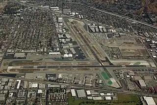 Originalmente, el aeropuerto estaba ubicado completamente dentro de los límites de la ciudad de Burbank, pero el extremo norte de la Pista 15/33 se ha extendido desde entonces a la ciudad de Los Ángeles.