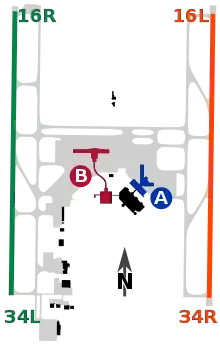 El aeropuerto tiene dos terminales, la terminal A y la terminal B. En total, el aeropuerto tiene 32 puertas, 19 en la terminal B y 13 en la terminal A. La antigua terminal B tenía 14 puertas. 8 líneas aéreas operan desde la Terminal B y 6 líneas aéreas operan desde la Terminal A.