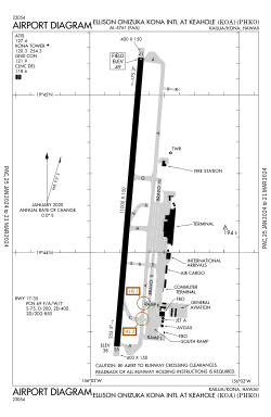 El Aeropuerto Internacional Ellison Onizuka Kona en Keāhole[3] (del inglés: Kona International Airport) (IATA: KOA, OACI: PHKO, FAA LID: KOA) se encuentra en la Isla de Hawái, en Kalaoa, Condado de Hawái, Hawái, Estados Unidos.[4] El aeropuerto sirve a la isla de sotavento (oeste) de Hawái, incluida la ciudad de Kailua-Kona y los centros turísticos de los distritos de North Kona y South Kohala.