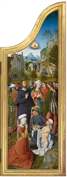 La persona que encargó la obra fue Adolfo de Cleves, señor de Ravenstein, un poderoso individuo relacionado con los gobernantes de Borgoña. Está representado en la parte delantera y central del panel izquierdo titulado Las bodas de Caná.[15] El tríptico representa en el ala izquierda el primer milagro de Cristo en las bodas de Caná y termina con el último milagro de Cristo, la resurrección de Lázaro, que se representa en el ala derecha atribuido a van den Bossche. El panel central representa el milagro de la multiplicación de los panes.[14]