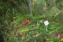 Es una planta de hábitos de epífita trepadora que produce racimos de flores rojas desde el verano al invierno.[1]