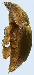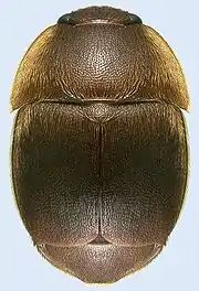 Pequeño escarabajo de las colmenas Aethina tumida, Murray (1867). Es un escarabajo del Orden Coleoptera, de la Familia Nitidulidae, un grupo caracterizado por su afinidad a productos de plantas que fermentan. En el caso de Aethina tumida, la afinidad a los productos de plantas que fermentan asociada con las colonias de las abejas, por nombrar miel y polen, pero se puede reproducir en frutas fermentadas (existen numerosas especies). Se piensa que fue transportado a Norteamérica en frutas contaminadas desde el sur de África, de donde son originarios. El Pequeño Escarabajo de la Colmena. El adulto del Pequeño Escarabajo es de aproximadamente 3/16 a 1/4 pulgadas de largo y oval con dos antenas muy características terminadas en forma de mazo. Es un volador fuerte, entra al interior de las colmenas volando por la piquera, se mueve rápido. La larva se ve superficialmente similar a la larva de la polilla de la cera.
