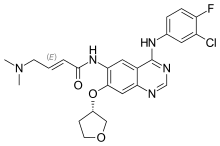 Afatinib denominación Común Internacional (DCI); nombre comercial en Estados Unidos: [Gilotrif] y en Europa Giotrif, previamente Tomtovok® y Tovok®.[1] Este medicamento aprobado en numerosos países para el tratamiento del carcinoma pulmonar no microcítico metastásico (mutación EGFR positivo). Afatinib ha sido desarrollado por [Boehringer Ingelheim][2][3][4] y es un inhibidor irreversible de los siguientes receptores de tirosina quinasa: receptor del factor de crecimiento epidérmico (EGFR, ErbB-1 o HER 1), erbB-2 (HER2) y ErbB-4.