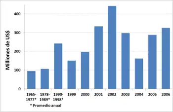Desde que el sector fue preparado para autofinanciarse, las inversiones aumentaron de manera evidente de un promedio anual de aproximadamente US$ 100 millones entre 1965 y 1989 a un promedio anual de US$ 242 millones entre 1990 y 1998, cuando se privatizó a la primera empresa.[40] Según las cifras de la SISS, desde 1998 las inversiones anuales oscilaron entre US$ 151 millones (1999) y US$ 443 millones (2002)[41] La inversión total en el año 2006 fue de US$ 325 millones.[42]