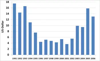 Según la CONAGUA, se invirtieron US$ 1.4 mil millones (14.7 mil millones de pesos mexicanos[13]), que son US$ 13 per cápita en el sector urbano de agua potable y saneamiento en 2006. Comparado con las inversiones entre 1996 y 2002, que eran de entre US$ 3.7 y US$ 5.5, esto significa un aumento notable. Sin embargo, el nivel de inversiones a partir de los años 90 era más alto. La inversión promedia per cápita entre 1997 y 2003 en México es más alta que en Costa Rica, Ecuador y Honduras, pero otros países mayores de América Latina como Colombia o Argentina gastaron más en el sector.[14]