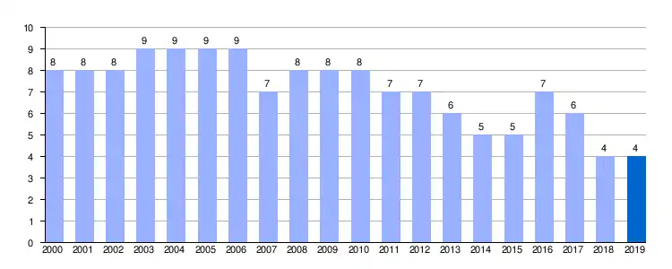 Gráfica de evolución demográfica de Aguiar[8] entre 2000 y 2019