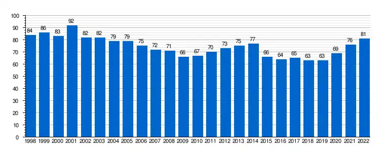 | Gráfica de evolución demográfica de Aguilar del Alfambra[7] entre 1998 y 2022 |