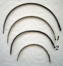 Una aguja es un filamento de metal, cobre u otro material duro , de tamaño relativamente pequeño, generalmente recto, afilado en un extremo y con el otro acabado en un ojo o asa para insertar un hilo. Es empleado desde tiempos prehistóricos para coser.