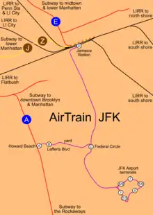 AirTrain conecta las terminales del aeropuerto y los estacionamientos con el Long Island Rail Road y las líneas del Metro de Nueva York en las estaciones Jamaica y Howard Beach en Queens. El sistema consiste de tres sistemas de sobrepaso: