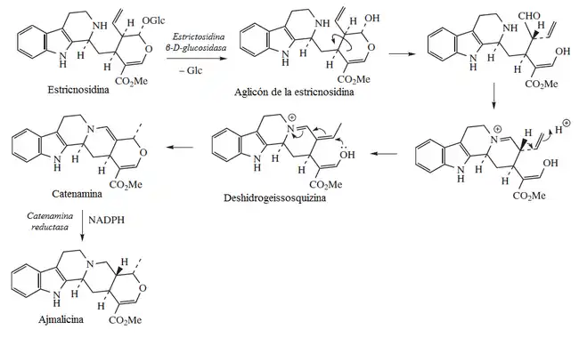La ajmalicina es un alcaloide β-carbolínico relacionado con la yohimbina, rauwolscina, y otros derivados del yohimbano. Proviene de la estricnosidina, el precursor de los alcaloides β-carbolínicos que se obtiene por una condensación tipo Mannich de la triptamina y el iridoide secologanina.[6]