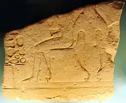 ![]() Inscripción del templo de Ramsés II que relata la apertura de un pozo de agua en el camino del desierto oriental que conduce a las minas de oro del Uadi Alaki. Museo de La Plata. | ||