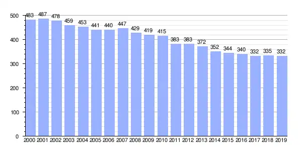 Gráfica de evolución demográfica de Alón entre 2000 y 2019