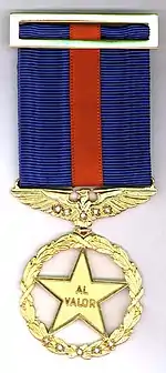 Descripción Cinta tricolor azul, blanca y roja, de la que pende un cóndor dorado que a su vez, sostiene una estrella dorada de cinco puntas esmaltadas en rojo, en cuyo centro se lee "Al Valor".[1]