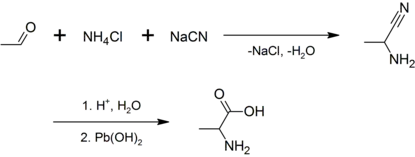 La alanina racémica puede ser sintetizada por la condensación del acetaldehído con cloruro de amonio en la presencia de cianuro de sodio a través de una síntesis de Strecker, o por amonólisis del, ácido 2-bromopropiónico:[6]