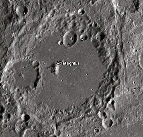Los cráteres satélite son pequeños cráteres situados próximos al cráter principal, recibiendo el mismo nombre que dicho cráter acompañado de una letra mayúscula complementaria (incluso si la formación de estos cráteres es independiente de la formación del cráter principal). Por convención, estas características son identificadas en mapas lunares poniendo la letra en el lado del punto medio del cráter que se encuentre más cercano al Albategnius.