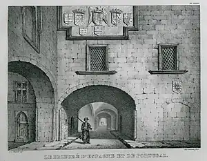 El Albergue de la Lengua de España y Portugal en la ciudad medieval de Rodas. (Rottiers Bernard Eugène Antoine. Monuments de Rhodes [Album], Brussels, Mme V. A. Colinez, 1828)