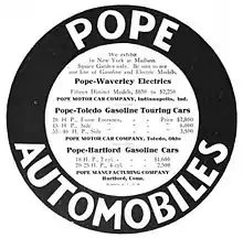 Entre los años 1903 y 1915, la compañía operó distintas compañías automovilísticas: Pope-Hartford (1903–1914), Pope-Robinson, Pope-Toledo (1903–1909), Pope-Tribune (1904–1907) y Pope-Waverly.[24]