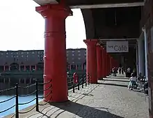 Uno de los elementos más notables del Albert Dock son las enormes columnas de hierro fundido que bordean el muelle.[46] Con una altura de 4,6 m y una circunferencia de casi 4 m, las columnas están basadas en el orden dórico de la arquitectura griega.[47] La decisión de Hartley de usar hierro fundido era una decisión económica, dado que en la época era más barato que el granito. No obstante, debido a los enormes muros de contención del muelle, la construcción del Albert Dock necesitó tanto granito que el fideicomisario del muelle tuvo que abrir su propia mina en Kirkcudbrightshire (Escocia).[6][46] La calidad de los materiales de construcción usados y el gran tamaño del complejo se consideran una potente ilustración de la gran prosperidad que el Puerto de Liverpool otorgó a la ciudad en la época. El estilo del edificio ha sido descrito como «clasicismo ciclópeo».[47]