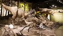 Existen numerosas evidencias de un comportamiento gregario entre dinosaurios herbívoros, incluyendo ceratopsianos y hadrosaurios.[43] Por el contrario, solo en raras ocasiones se han hallado varios dinosaurios depredadores en un mismo sitio. Pequeños terópodos como Coelophysis bauri, Deinonychus antirrhopus[44] y Megapnosaurus rhodesiensis[45] han sido encontrados en grupos, cuando hay depredadores más grandes como Allosaurus fragilis o Mapusaurus roseae.[46] También existen ciertas evidencias de comportamiento gregario en otros tiranosáuridos. Restos fragmentarios de individuos más pequeños fueron encontrados junto a Sue, un ejemplar de Tyrannosaurus rex montado en el Museo Field de Historia Natural en Chicago. Una capa de huesos en la Formación Two Medicine de Montana contenía al menos tres especímenes de una especie no nombrada de Daspletosaurus, preservados junto a varios hadrosaurios.[47] Estos hallazgos pueden corroborar la evidencia de un comportamiento social en Albertosaurus, aunque algunos o todos los lugares ya mencionados pueden representar agregaciones temporales o no naturales.[8] Otros han especulado que en vez de grupos sociales, por lo menos algunos de estos hallazgos representan un caso de frenesí alimentario similar a los de los dragones de Komodo sobre reses muertas, donde los carnívoros compiten agresivamente, pudiendo morir alguno en las luchas, sobre el cual el resto practica el canibalismo.[39]